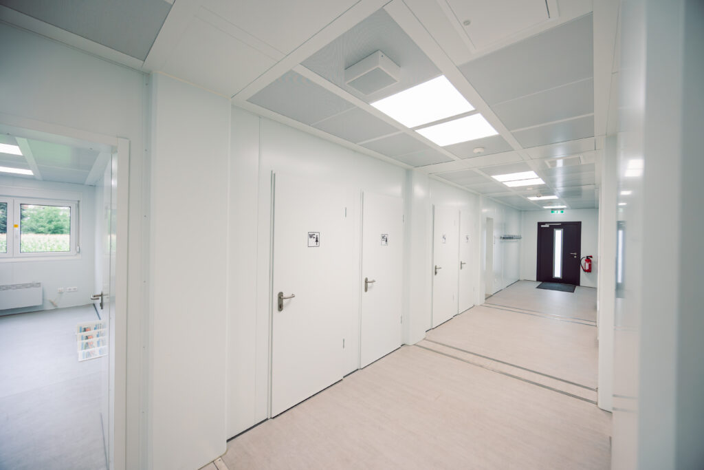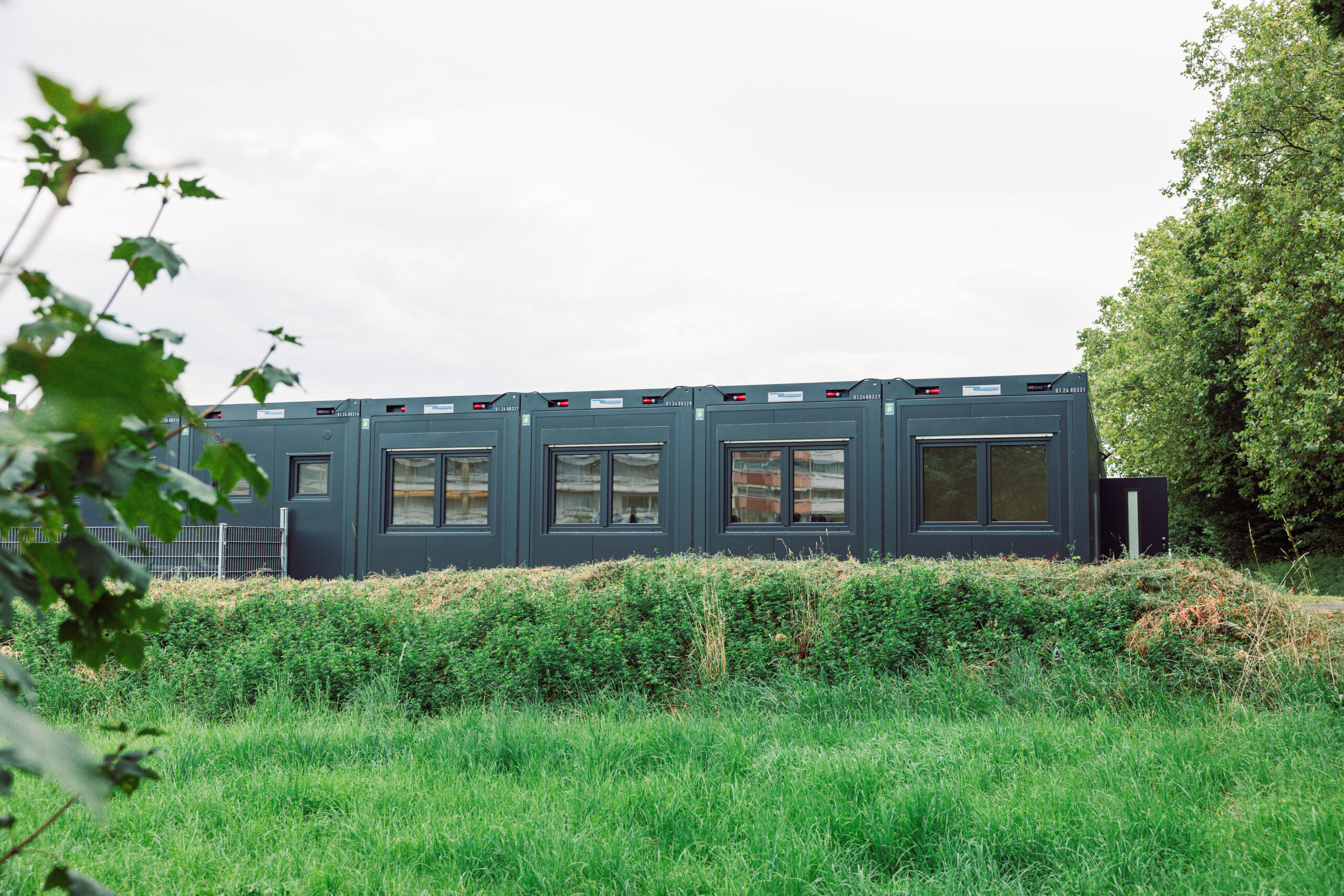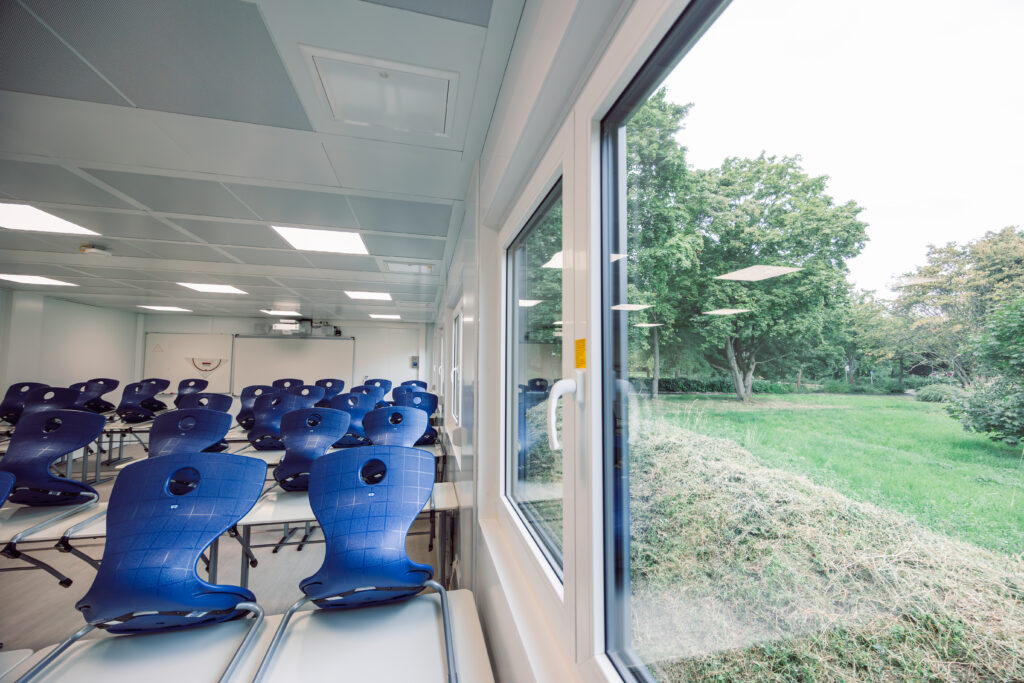 Neben den Klassenzimmern bietet die Anlage moderne Sanitärbereiche sowie eine vollständig untergebrachte IT-Infrastruktur im Technikcontainer. Die anthrazitfarbene, isolierte Außenfassade sorgt für ein zeitgemäßes Erscheinungsbild.
