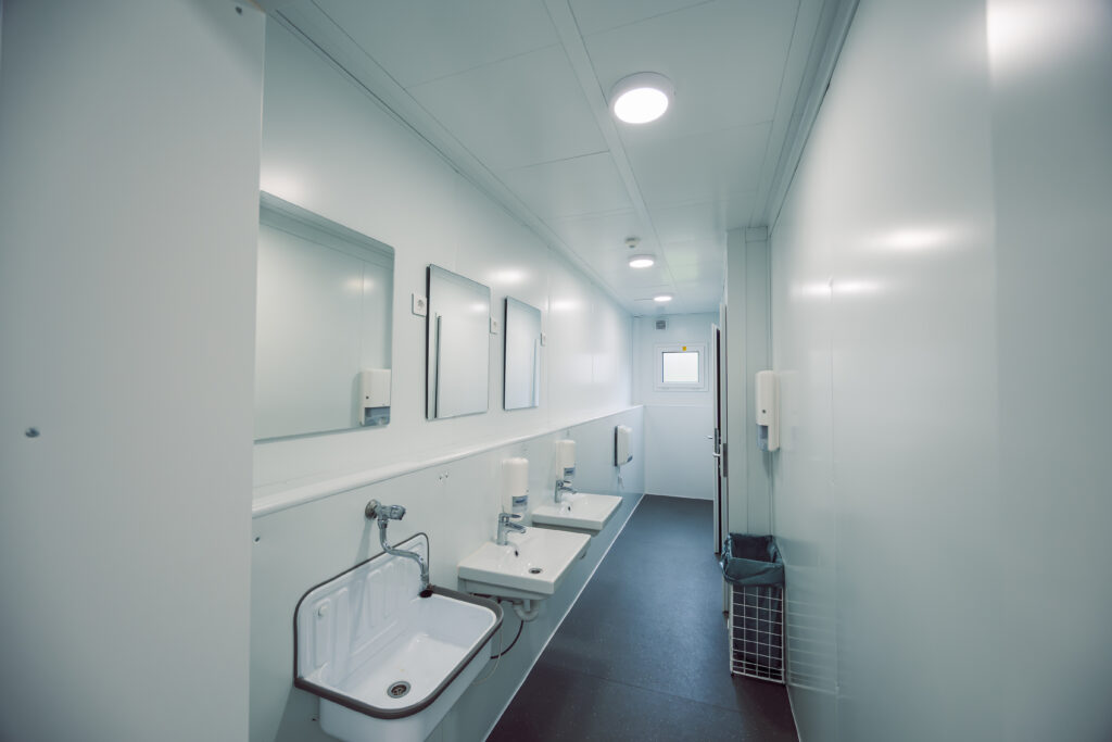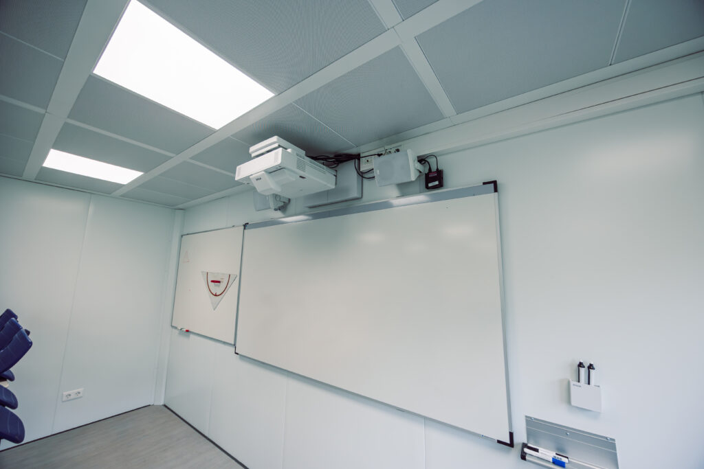Jedes Klassenzimmer setzt sich aus vier Containern zusammen. Akustisch optimierte Decken sorgen für eine ruhige Lernatmosphäre, während verstärkte Wandpaneele die Installation moderner Lernmedien wie Beamer, Lautsprecher oder Präsentationstafeln ermöglichen. Ein durchgängiger Bodenbelag schafft ein harmonisches Raumgefühl, und dank unseres Verbindungssystems entsteht ein ebener Boden – ohne zusätzlichen Aufbau.