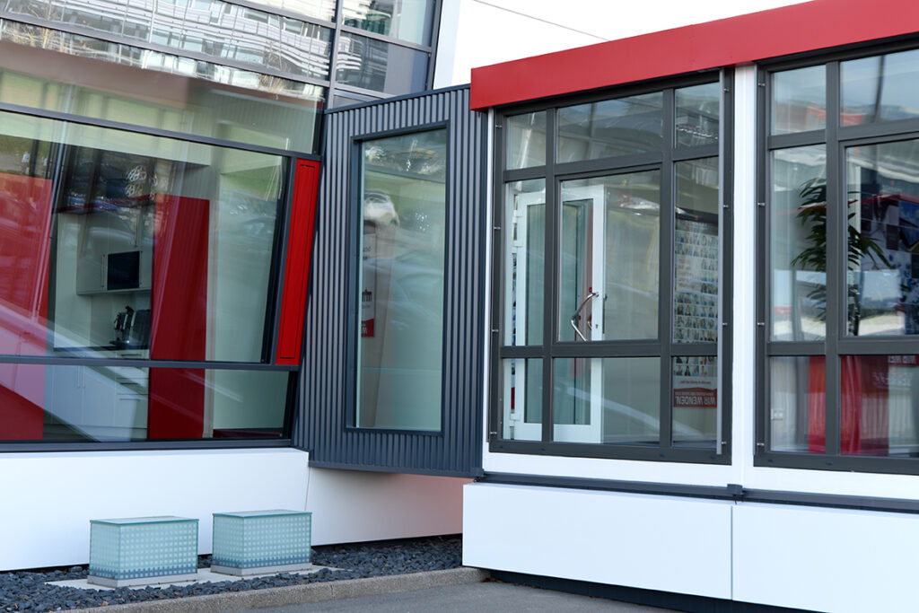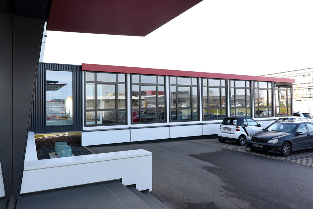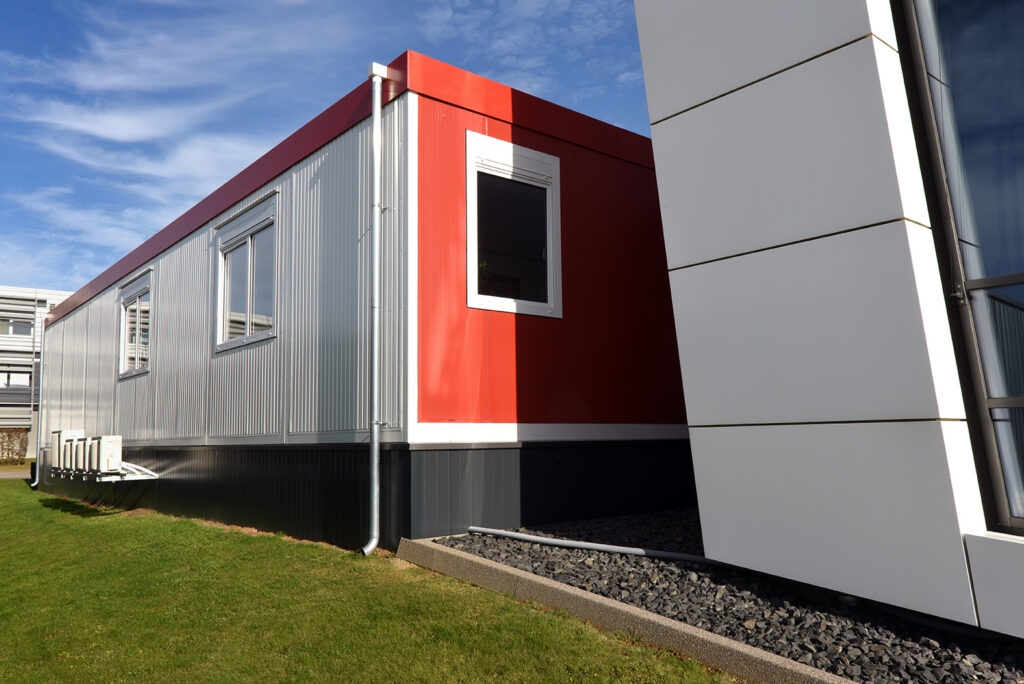 Das neu geschaffene Bürogebäude ist optisch abgestimmt auf das Design des Hauptgebäudes und stellt eine durchdachte Erweiterung dar. Die Module wurden im rechten Winkel zum Hauptgebäude auf dem Firmenparkplatz platziert und durch einen eigens designten, geschützten Übergang mit dem Bestandsbau verbunden.
